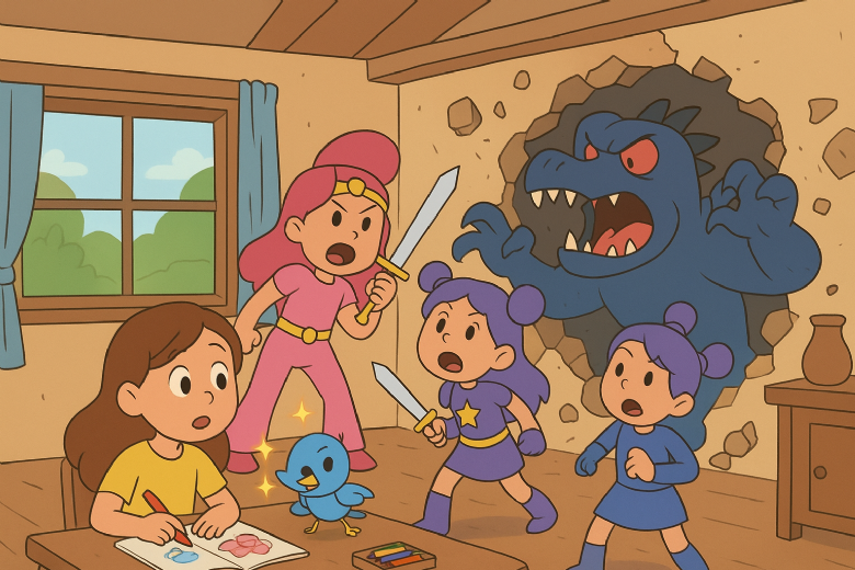 Back in a small little cottage, a little girl sat colouring at her desk, her name was Sinthia. Suddenly she saw a little bird flying through her window, then the little bird turned into Trace-dot! "Who are you?" asked Sinthia who was very suprised..."I'm Trace-dot, would you like to see my sword" said Trace-dot. But Sinthia didn't get a chance to answer, because then two crows flew into her room right through her window and shape shifted into Rosita and Star-ripple."Do you still have you sword?" said Star-ripple to Trace... "yes, why do you ask?" then Sinthia asked "why do you have swords?" ...."Ermm do you think we need swords?" said Rosita. "Yes!" they all said..."why?" she asked.