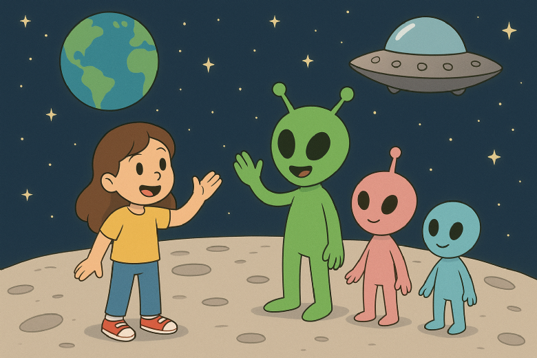 After some time, she saw something strange....Aliens! They looked friendly, so Daisy went to say Hello. As she got closer, she saw something even stranger.....her lost family next to the Aliens!! Daisy was so happy to see her family, but also terrified at the same time. Her family explained that the cow had ran at them and they jumped out of the way and ended up on the moon! Daisy said, "No way, that happened to me too!" They all had a big cuddle as they missed each other so much. Daisy's family told her that they had been watching over her for the last year and were so proud of her.
