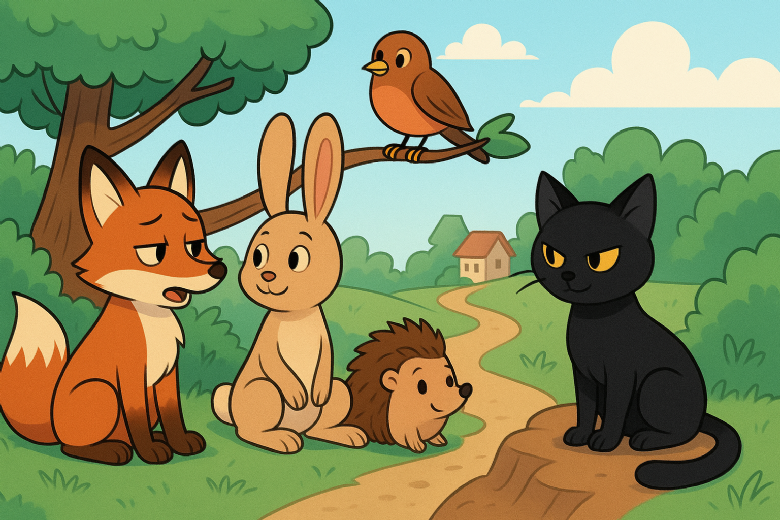 Once upon a time, there were three animals, a fox, a rabbit, a robin. One day, Fox said “I’m bored, do you know what to do?” looking at Rabbit. “No” replied Rabbit. “What about you Robin?” Robin remained still, perching on the branch while Fox and Rabbit lay in the fresh grass. “I’ve got an idea!” chirped Robin out of nowhere. “Really? Let’s hear it.” said Rabbit intrigued. “Let’s see Cat!”, answered Robin. Fox’s eyes widened in response to what Robin had said. “You mean Black Cat?!” said Fox with surprisment in her eyes. “Yeah!” Robin said, staying in her normal, non-worried, jolly spirit. “Guess that’s not a too-bad idea.” replied Rabbit. Fox closed her eyes tightly and did a small shudder, shaking her concerned thoughts out of her head. Once she had got the thoughts out of her head and opened her eyes she said “Not a bad idea? it’s a really bad idea!” Rabbit and Robbin didn’t hear Fox because they had already started walking along the narrow path that led towards the village. Fox dragged her paws behind them, looked down at the path and thought to herself what are they thinking? Once they got to Black Cat, the three forest creatures faced her. Fox, Rabbit and Robin realised they were on a dusty, small cliff that separated the village and the forest. “Hello” said the Black Cat mysteriously, as Fox backed out of the conversation. “Hi!” Robin chirped back. “Why do I find you here?” questioned Black Cat. “We were bored so we came to see you” replied Rabbit. “Well how pleasant” said Black Cat smirking.